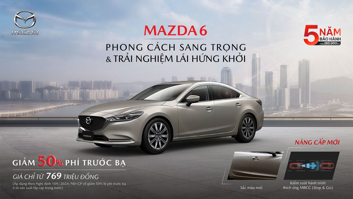 Nhằm gia tăng giá trị cho người sử dụng, Mazda6 vừa được bổ sung thêm các tính năng công nghệ cao cấp như: hệ thống kiểm soát hành trình thông minh MRCC Stop & Go; đèn chào mừng logo Mazda ở hai cửa trước hỗ trợ chiếu sáng, nút bấm khởi động và chìa khóa thông minh thiết kế hoàn toàn mới. Bên cạnh đó, mẫu xe này có thêm sắc màu mới Vàng Ánh Kim (Platinum Quartz) mang vẻ đẹp thanh lịch, khẳng định chất riêng của chủ sở hữu. Hiện tại giá bán Mazda6 dễ tiếp cận nhất phân khúc D, chỉ từ 769 triệu, ngang bằng với các mẫu sedan cỡ C.