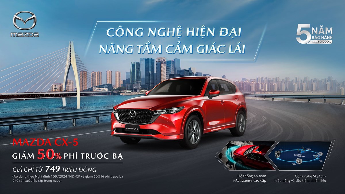 Mazda CX-5 là mẫu xe quen thuộc với người Việt trong phân khúc SUV 5 chỗ, nổi bật nhờ thiết kế thời thượng, không gian nội thất hiện đại. Đây cũng là mẫu xe bảo chứng doanh số của Mazda với hơn 1.000 xe đến tay khách hàng mỗi tháng và liên tục nằm trong top xe bán chạy nhất trên thị trường. Với giá bán khởi điểm chỉ từ 749 triệu, cùng đa dạng lựa chọn với 7 phiên bản, 2 tùy chọn động cơ 2.0 và 2.5 mạnh mẽ và hệ dẫn động AWD trứ danh, phù hợp nhu cầu sử dụng tất cả khách hàng.